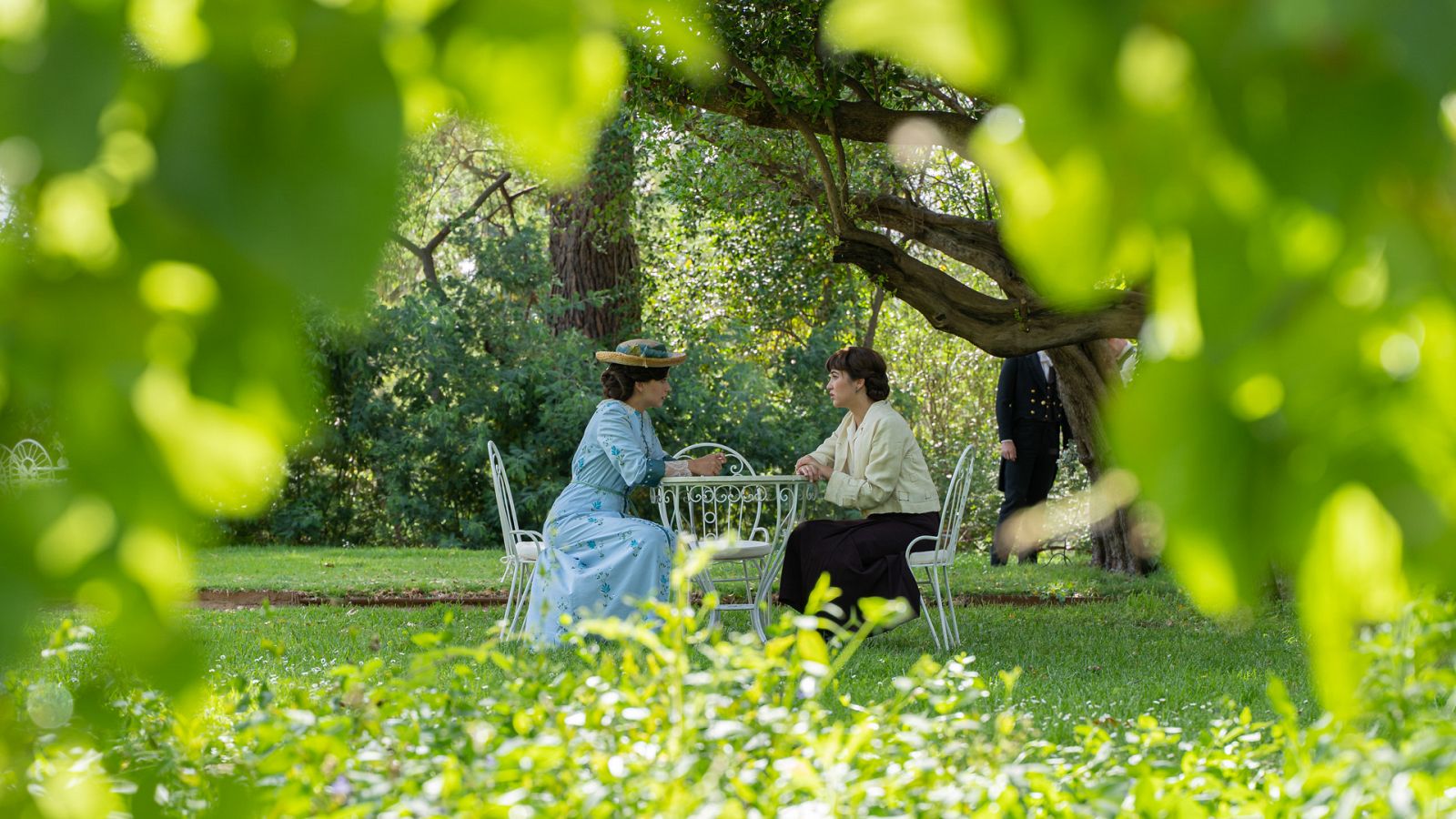 En mi opinión, la actual forma de producción como que si necesitan aprender un poco para adaptarse a un nivel tipo las Turcas y te pongo esta imagen de una escena de jardín la cual tiene detalles así y luego la toma cerca de la mesa y con más toque de desenfoque, como si fuera una serie.